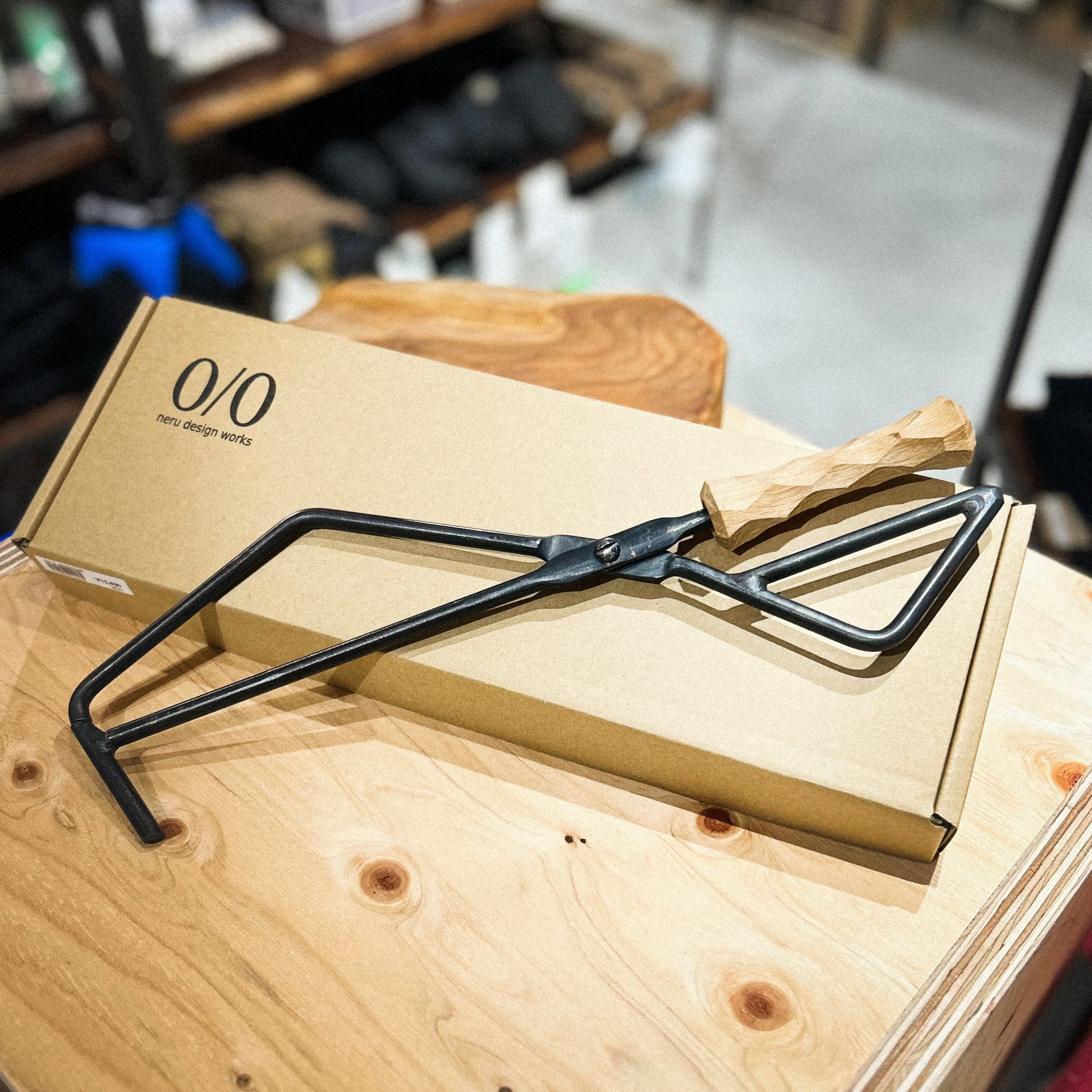 鉄とナラ材の無骨さを前面に押し出しながらも、スマートなシルエットを持つ薪ばさみ。