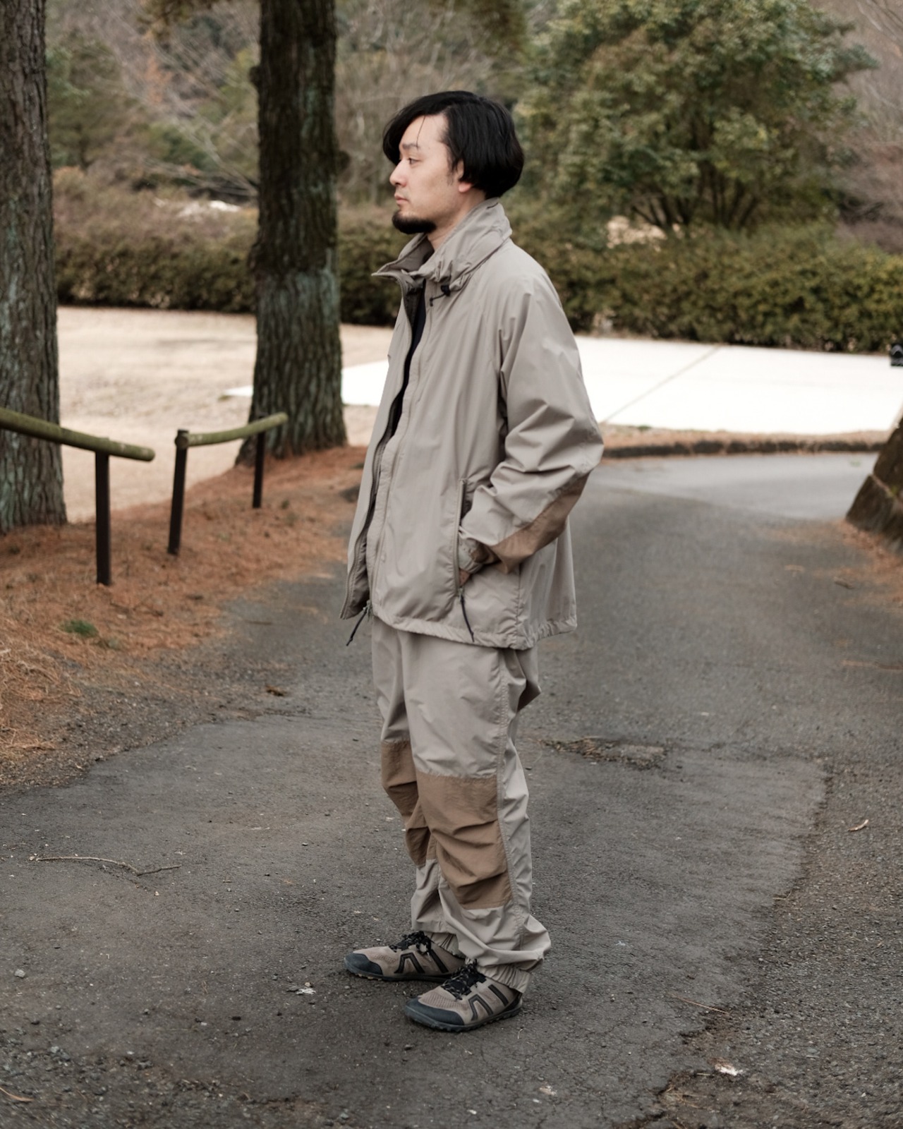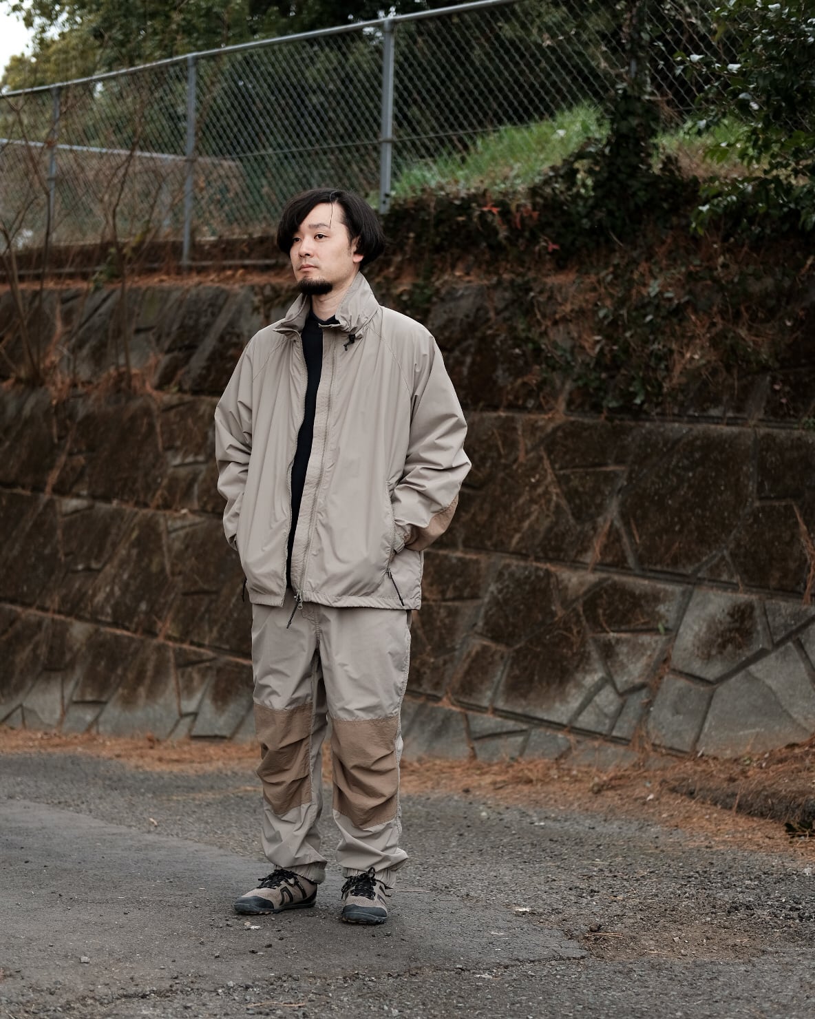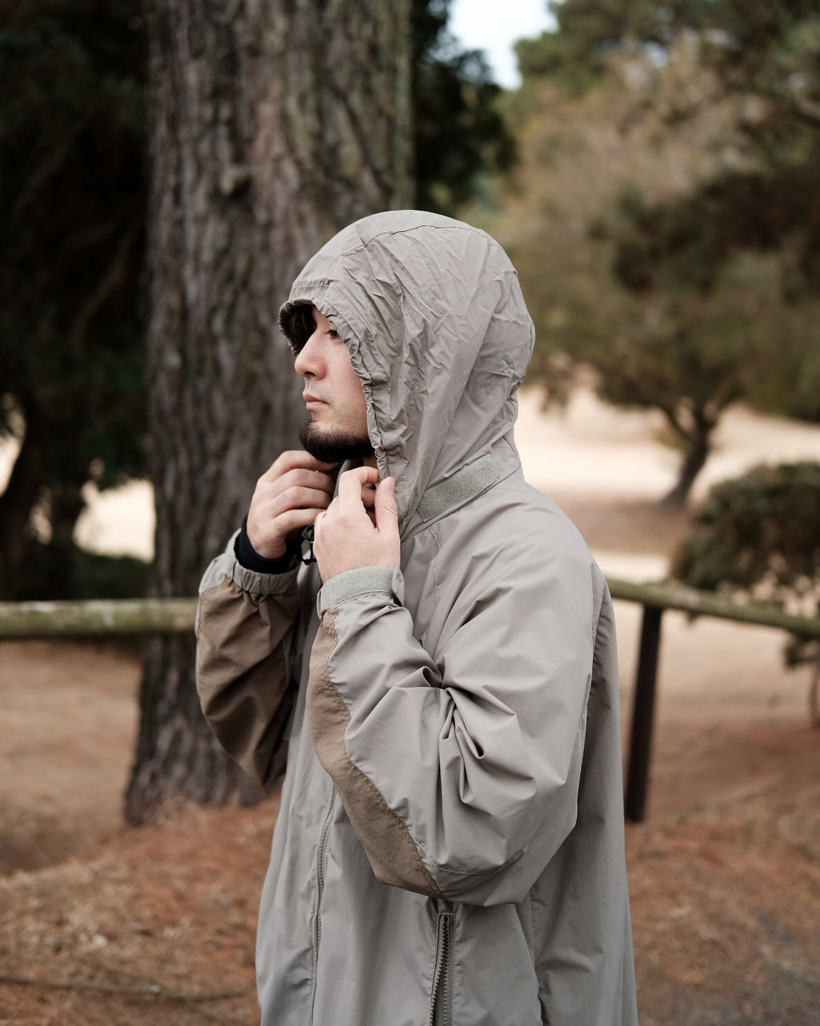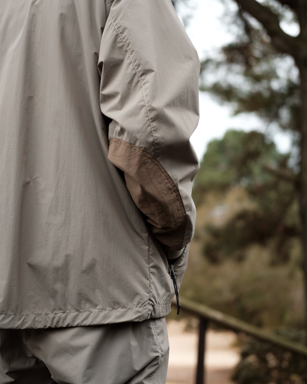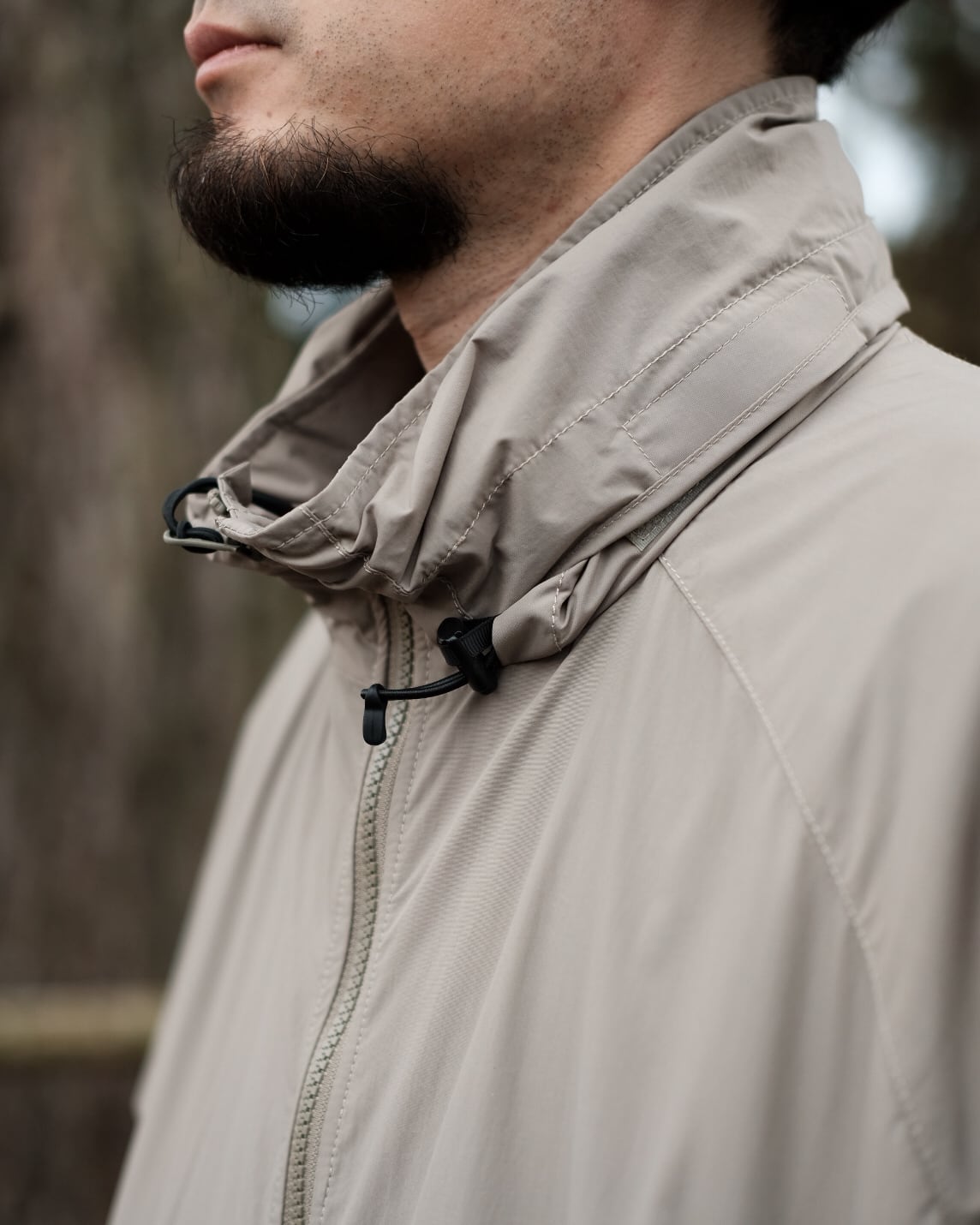 軽量でしなやかなエピックの一枚地ですので、雨天時のレインウェアとしても活躍します。やや大きめのシルエットですので、内側にニットやスウェットなどの上から羽織としても着用出来ます。立ち襟の中にフードを収納出来、裾のドローコードでサイズの調整が容易です。肘の部分は二枚地で補強されています。