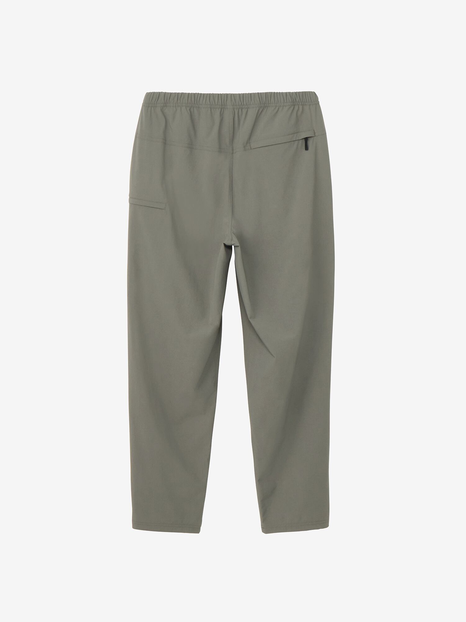 一部リサイクルナイロンを使用したリップストップ生地はストレッチ性と適度なハリ感があり、はっ水加工を施しているため多少の雨は弾きます。脚さばきが快適なテーパードシルエットで、左サイドには地図が入るサイズの縦長のポケットを配置。ウエストはサイズ調節のしやすいスピンドル仕様。UVケア(UPF15-30、紫外線カット率85%以上)機能付き。