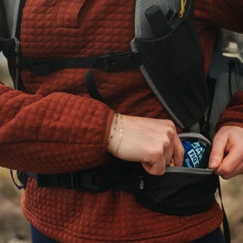 素材:パック部分/100D Recycled Robic Nylon(PFAS free), フロントポケット部分/UHMWPE Stretch Mesh(PFAS free)