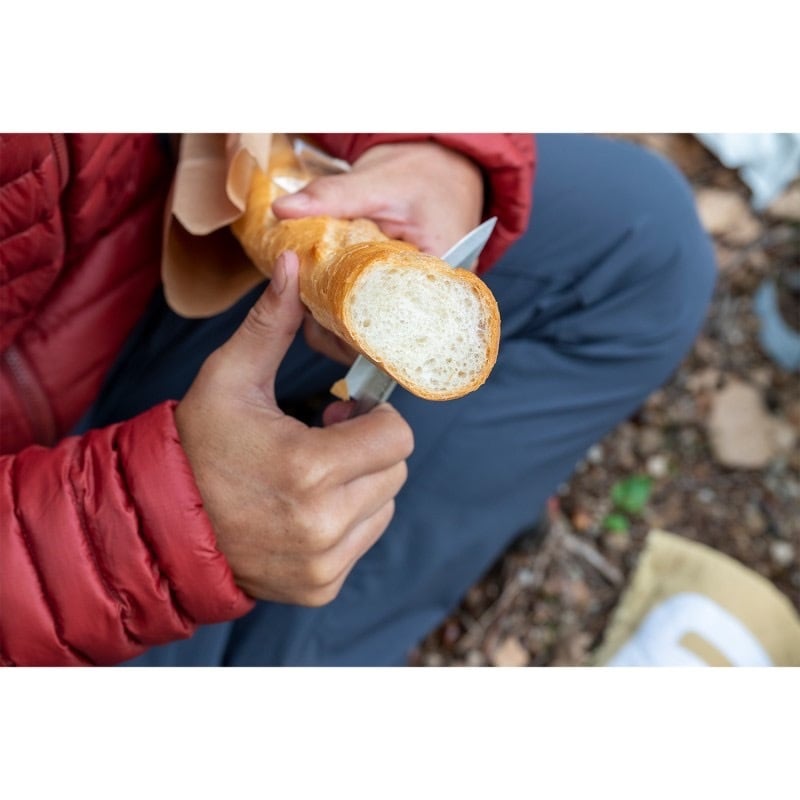 スッと食材に切り込む刃のカーブは河原の石の上でも、まな板を載せた膝の上でもスパっと食材を切る事が出来ます。