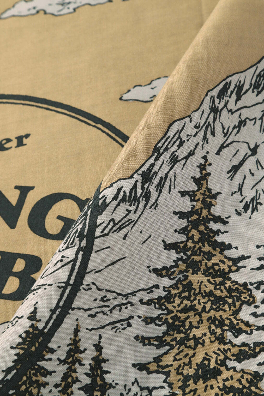 HIKING CLUBのイラストをプリントしたコットンのバンダナ。旧型のシャトル織機で織っているため軽くて丈夫な風合いに仕上がっています。30/1の平織り組織で、生地耳を利用しています。