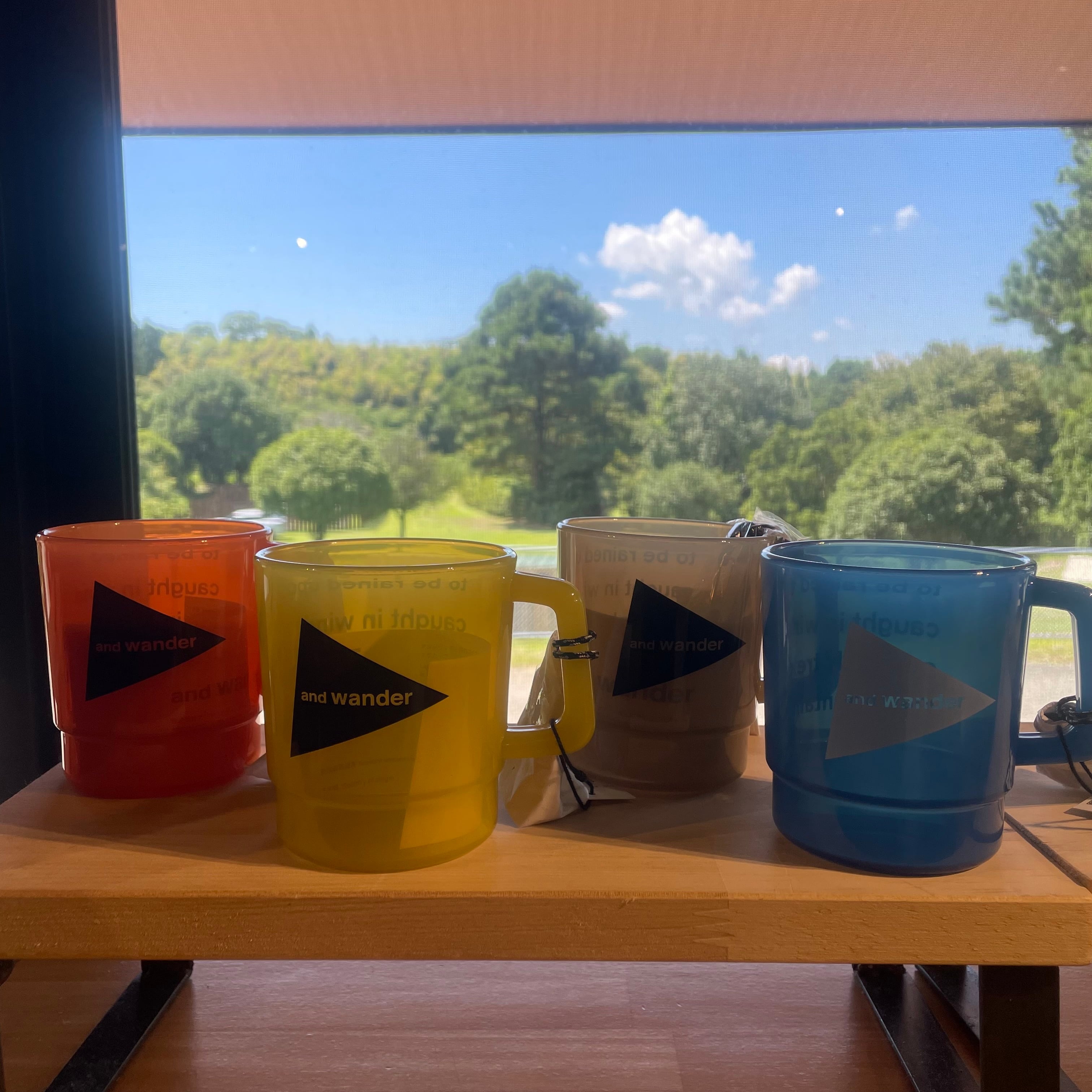 andwanderのロゴをプリントしたポリプロピレン製BPAフリーの軽量なマグカップ。カラビナでぶら下げることができます。スタッキング可能です。容量340ml、対応温度-20℃から120℃