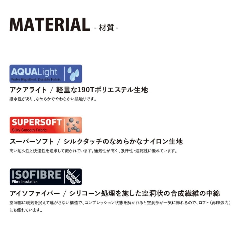 ●外側の生地には190Tの軽量なポリエステル生地「AQUA Light」を使用。撥水性がありなめらかで肌触りが良いです。