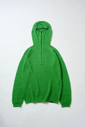 顔まで覆うバラクラバスタイルのフードを備えているので、首周りの防寒性も高く、特徴的な凸凹した表面感は、体温を衣類の中にしっかりとキープします。また縫い目がないので素肌に着てもゴロつきにくく、素肌の上に着た時に最高の機能を発揮します。