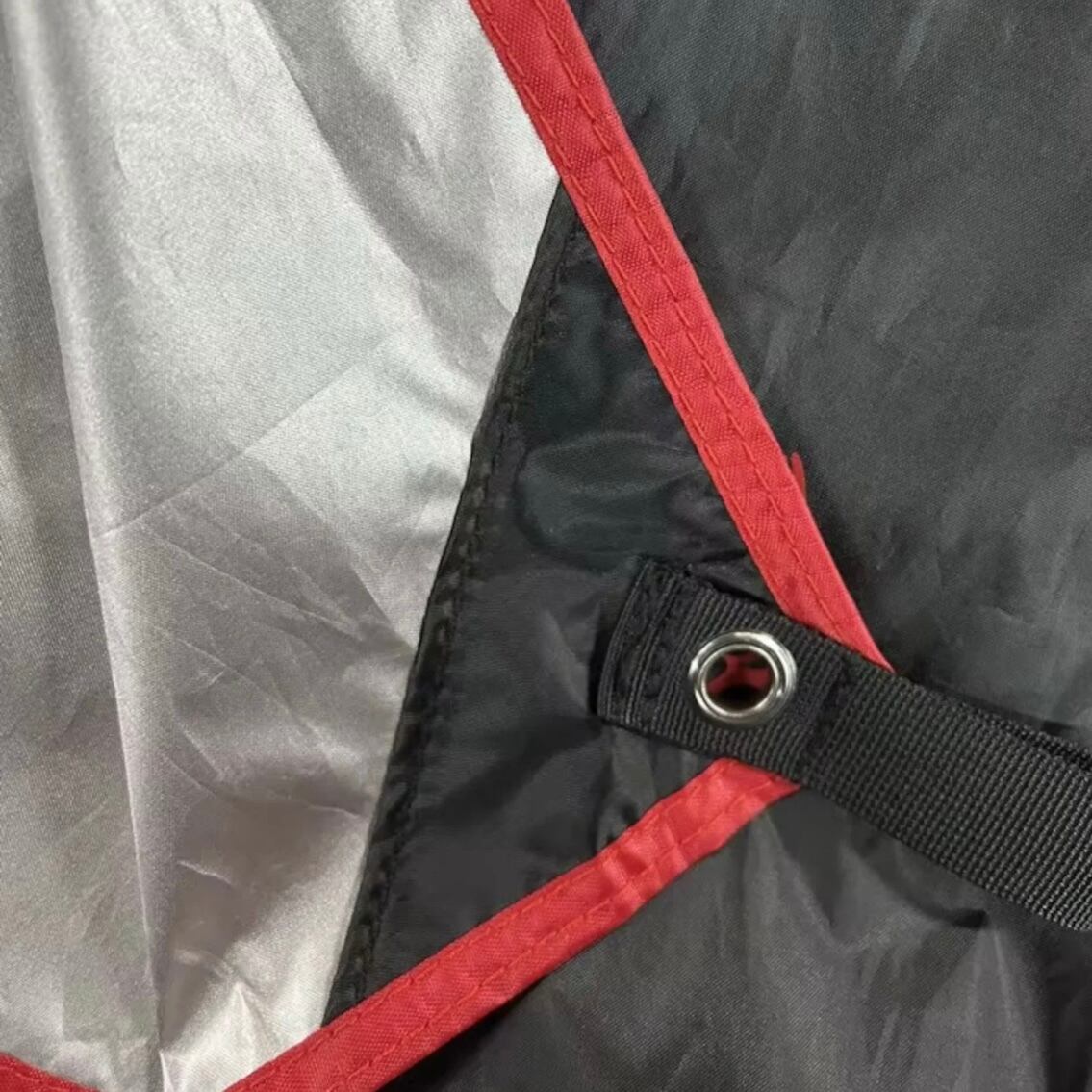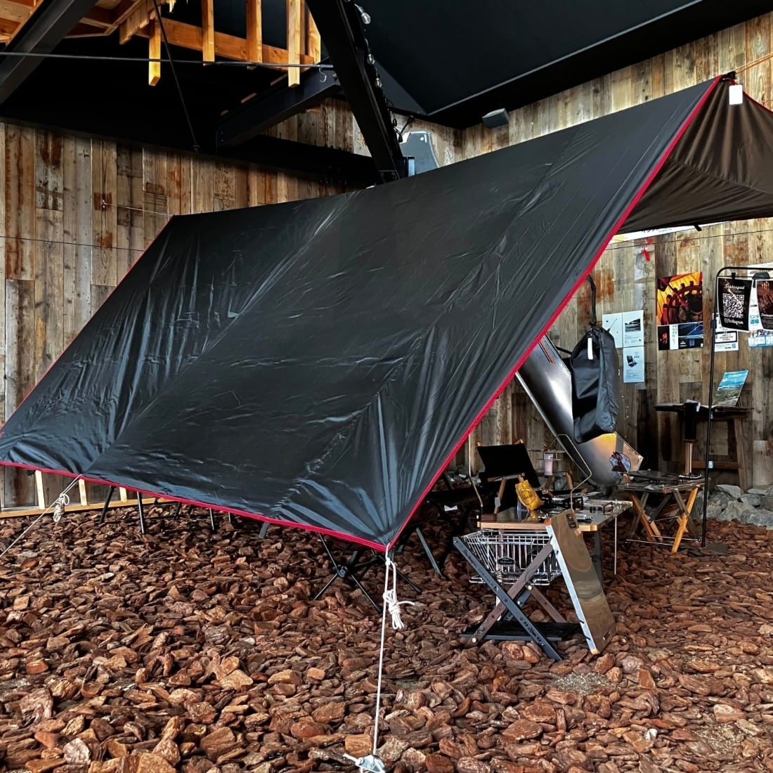 厚手のポリエステルにPUシルバーコーティングを施し、耐水性遮光性を高めたタープです。