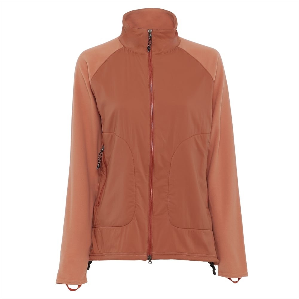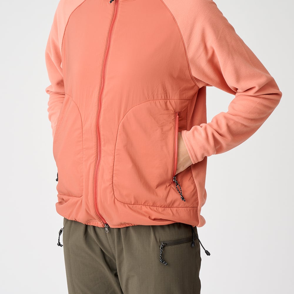 薄手でちょうどいい保温性のフリースジャケットの衿と前身頃だけに風を和らげる高通気シェルをレイヤードしたアクティブシェルです。フリースだけでは風が気になるけどシェルを羽織ると暑くて・・・、という悩みに答えます。レイヤードしやすいスタンドカラーを採用し、ポケットはバックパックのヒップベルトに干渉しないように少し高い位置に配置しています。