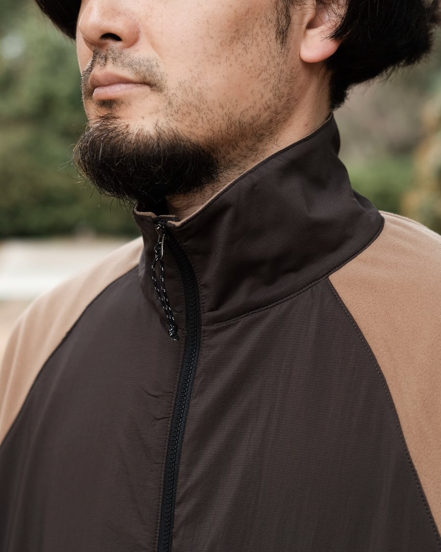 ・ 衿と前身頃に高通気シェルをレイヤードしたフリースジャケット