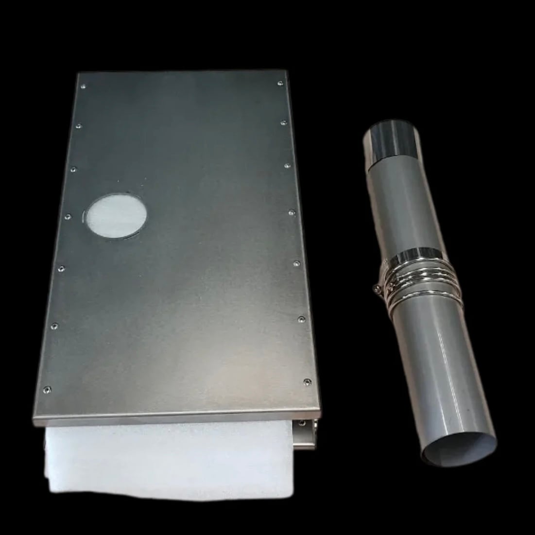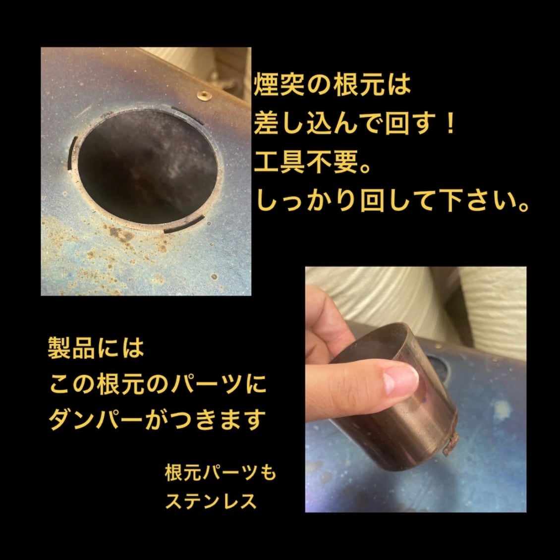 ステンレス製の煙突根元部分にはダンパーが装備され、空気の流れを調整可能です。標準装備の巻き煙突に加え、ZIVE スト付属の直径6cm煙突も使用可能。