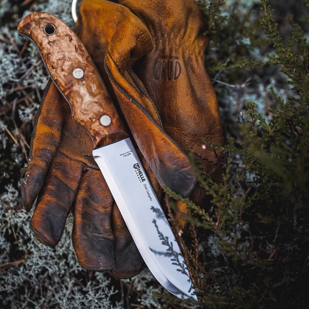 ハンドルには、ひとつひとつ木目の模様が異なる美しいカーリーバーチ(白樺)を使用。カーリーバーチは白樺の遺伝的多様性が生み出す独特の模様で知られており、この模様がナイフに独特の表情を与え、一つとして同じものがないのが特徴です。ヘレナイフで使用する木材は最低でも1年間、低温倉庫で保管し、ゆっくりと乾燥させます。その後様々な工程を経て、手作業でハンドルの形を整え仕上げをしています。全てのナイフは異なる手法と工程で作られていますが、始まりは同じで、中には、木材から完成品まで50もの工程があるナイフもあります。