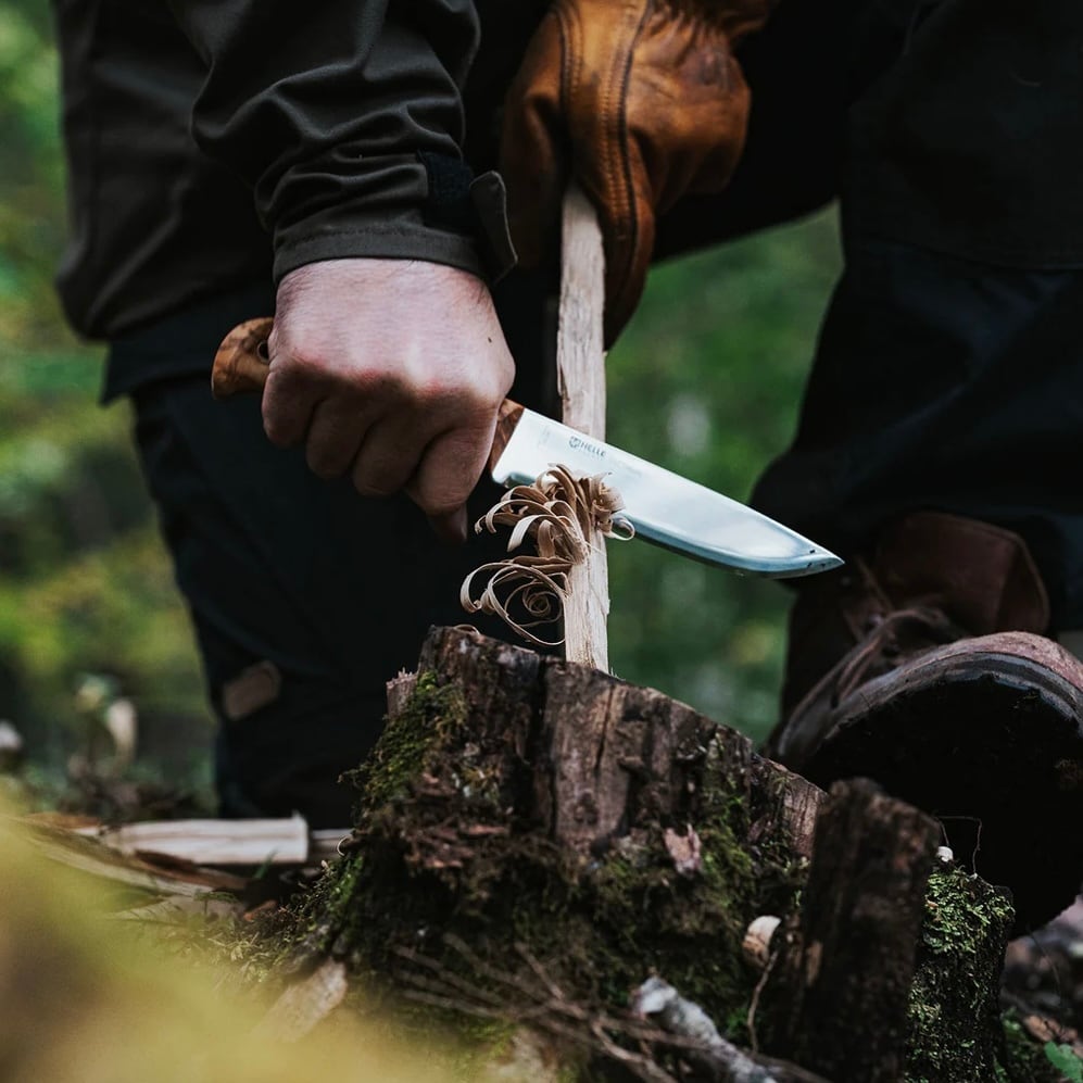 ブレードはフルタング(鋼材がハンドルの末端まである構造)になっており、鋼材は錆びにくく摩耗性に優れたステンレスを高度に研磨されたALLEIMA14C28Nスチールを使用。刃の厚みが3ミリあるので、バトニング(薪割り)などのヘビーな作業にも十分な強度と耐久性を備えています。