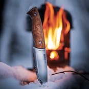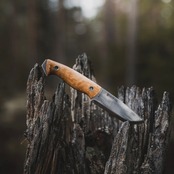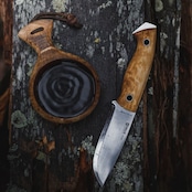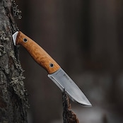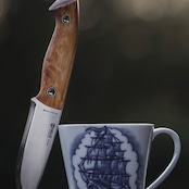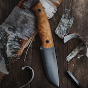 ハンドルには、ひとつひとつ木目の模様が異なる美しいカーリーバーチ(白樺)を使用。カーリーバーチは白樺の遺伝的多様性が生み出す独特の模様で知られており、この模様がナイフに独特の表情を与え、一つとして同じものがないのが特徴です。ユートゥベーラのハンドルは薄く少し平たく作られており、グローブをつけた状態でもしっかりと持てるようになっているほか、様々な持ち方ができるのでハンティングスキニングナイフのようなハンドリングも可能な形状となっています。また、ハンドルからブレード鋼材が突き出ており、即席のハンマーとして使用する事もできます。突き出ている箇所のブレードはエッジが付いており、この部分でファイヤースチールを使用することも可能です。ハンドルは2つのリベットで補強されてブレードに固定されており、リベットは中空なのでパラコードや革紐を通すこともできます。ハンドル材とブレードの間にある赤色のバルカンファイバーがいいアクセントになっているので思わず手に取りたくなるナイフです。