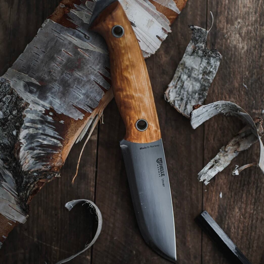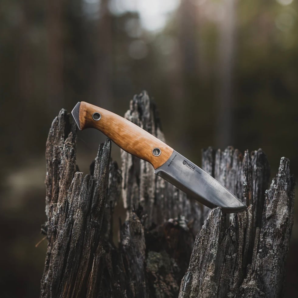 バトニングなどの切断はもちろんの事、ヘレナイフの他のフルタングモデルと比べて刃長が102mmと少し短く作られているので、取り回しがしやすいので軽く行うカービングナイフとしても使いやすいです。また、ユートゥベーラは、ブレードの幅が広く、刃先からポイント(切先)にかけてのアール(そりの部分)の立ち上がり角度が強くなっているので、ハンティング後のスキニングなどでも本来の力を発揮してくれます。