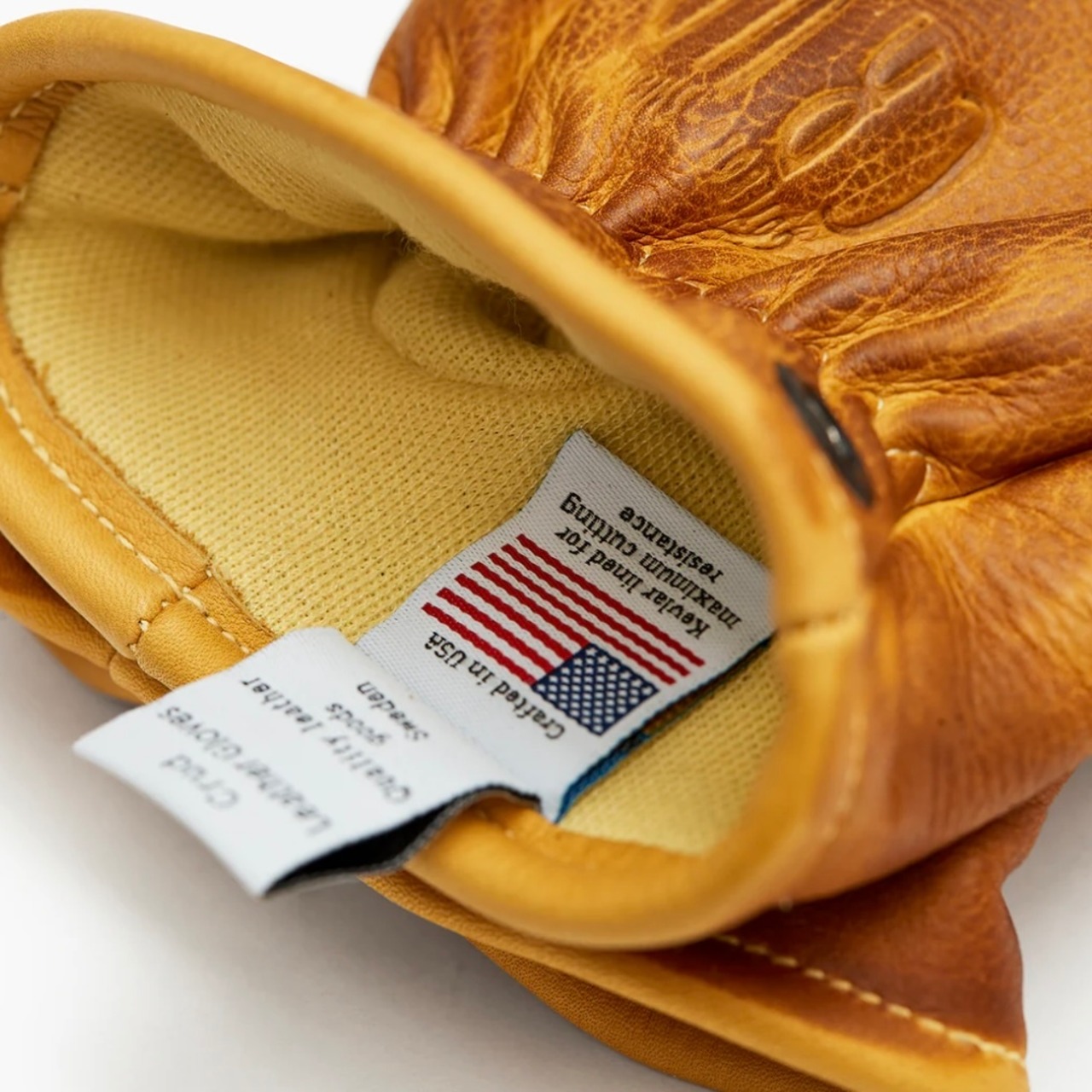 耐久性と耐熱性に優れたケブラー®は、擦り傷や切り傷から手を守るだけでなく、グローブ自体を長持ちさせるように設計されています。アメリカの熟練した職人が最高級のフルグレインレザーを一枚一枚断裁し、縫い合わせることで作られているディクソングローブは、縫い目にはウェルト(細い紐状の革)を縫い込み、外側に縫い目が出ないよう、処理が施されています。