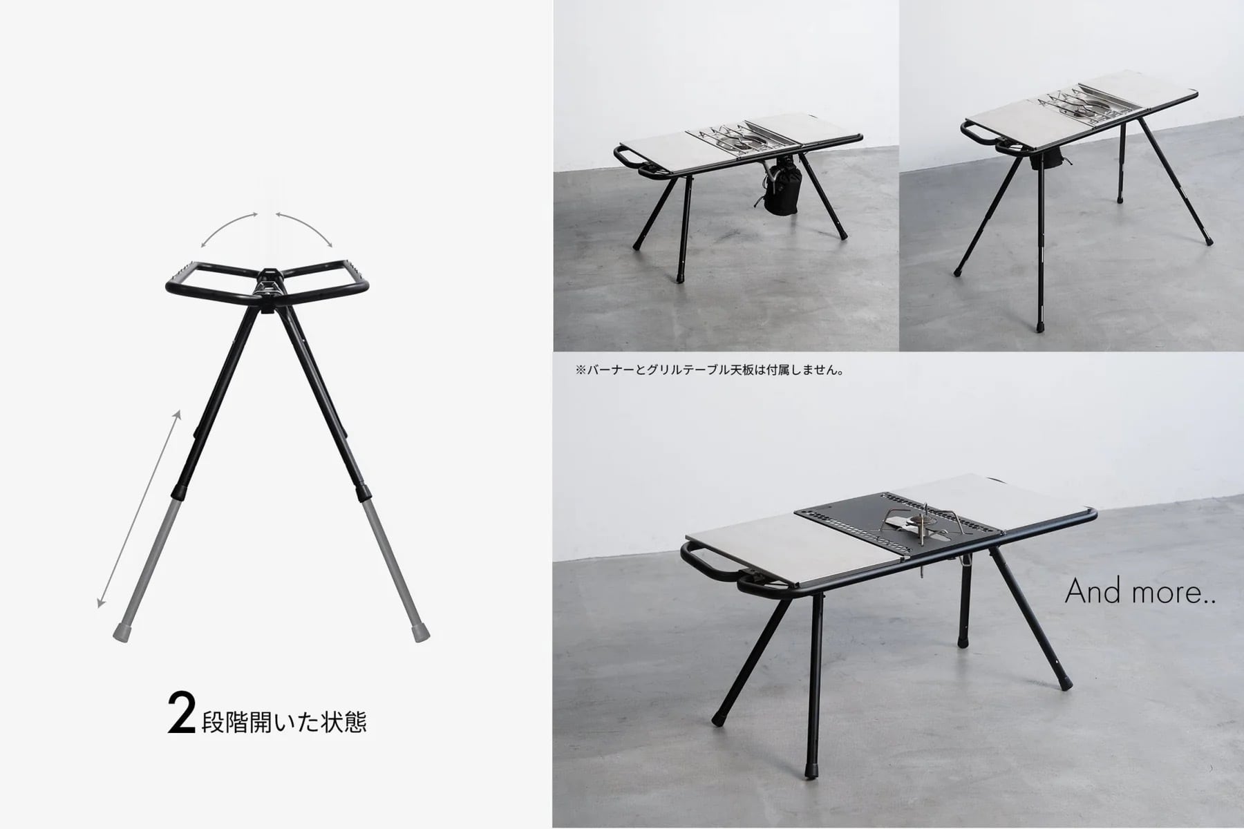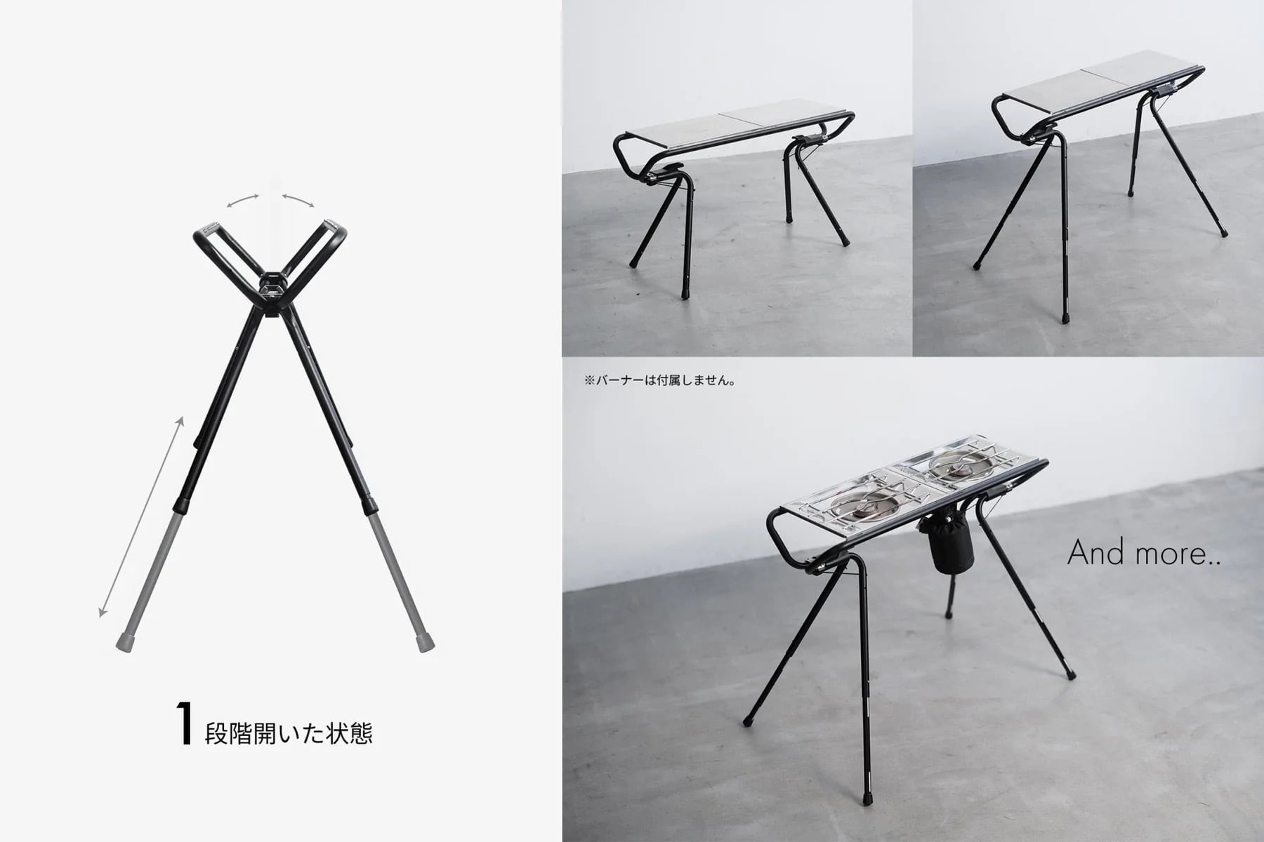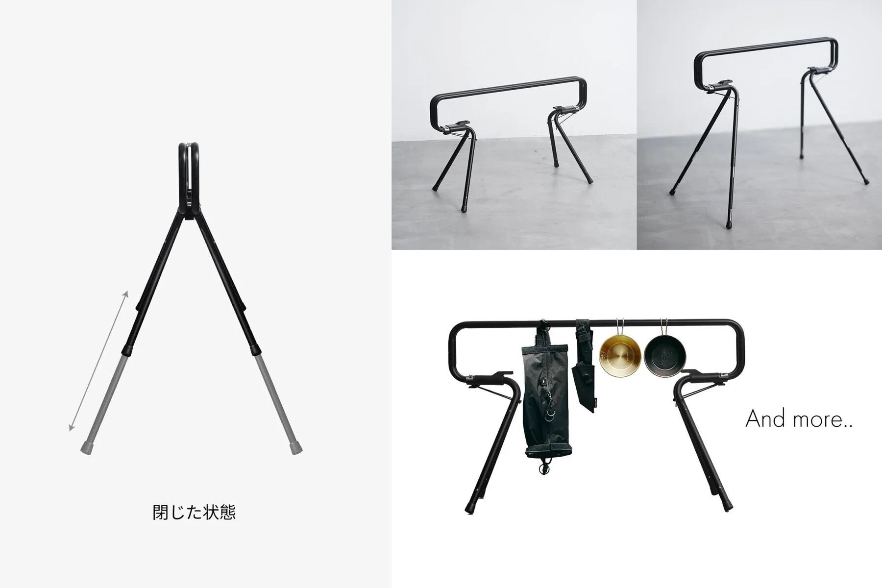道具を“便利”で終わらせるのではなく、使うほどに想像力を広げてくれる“相棒”のような存在でありたい。そこで、従来のテーブルのイメージを一新し、「変形」することで食事や作業に使えるテーブルになったり、ハンガーラックや棚としても活躍できる柔軟な構造を採用しました。ソロやデュオでのメインとしても、大型テーブルのサブとしても幅広く対応し、荷物を増やさずにどんなキャンプスタイルにも寄り添う多用途設計を実現しています。