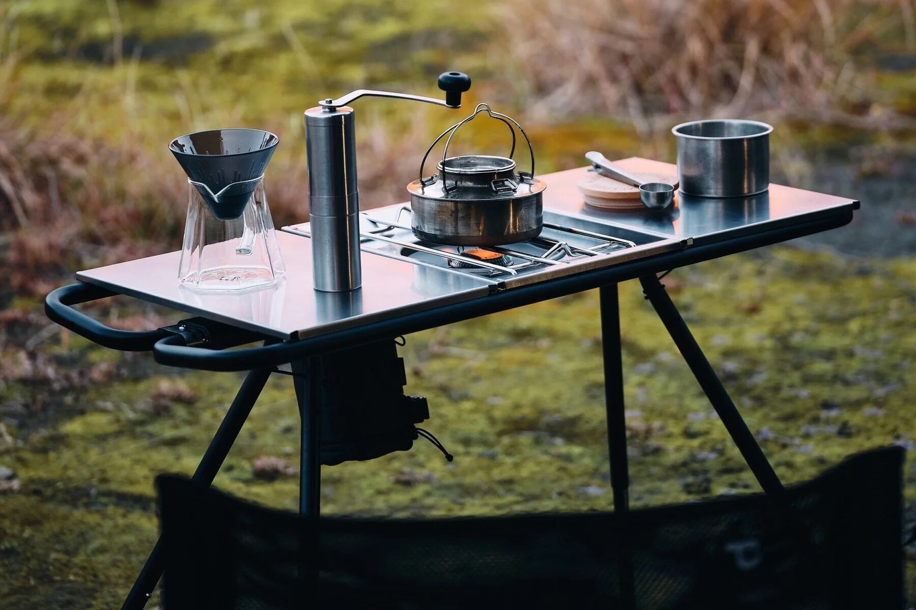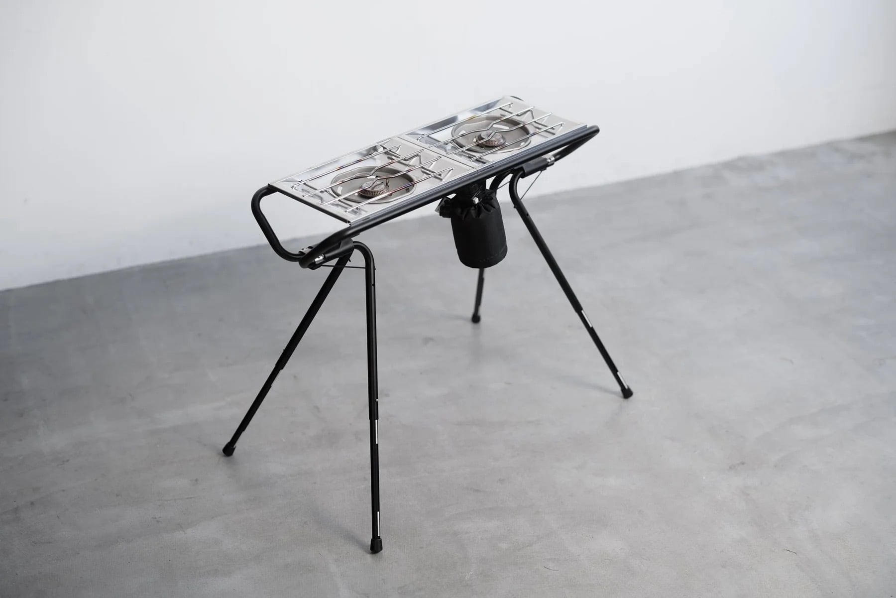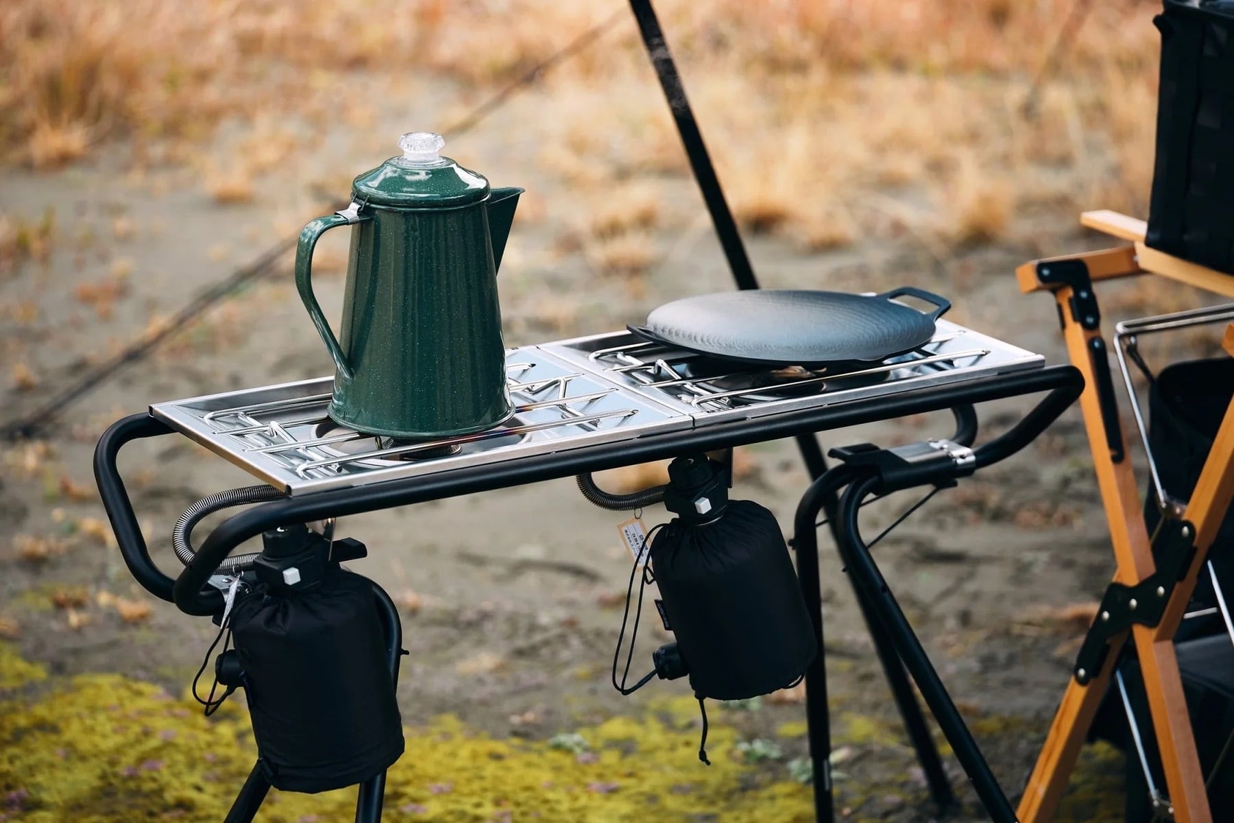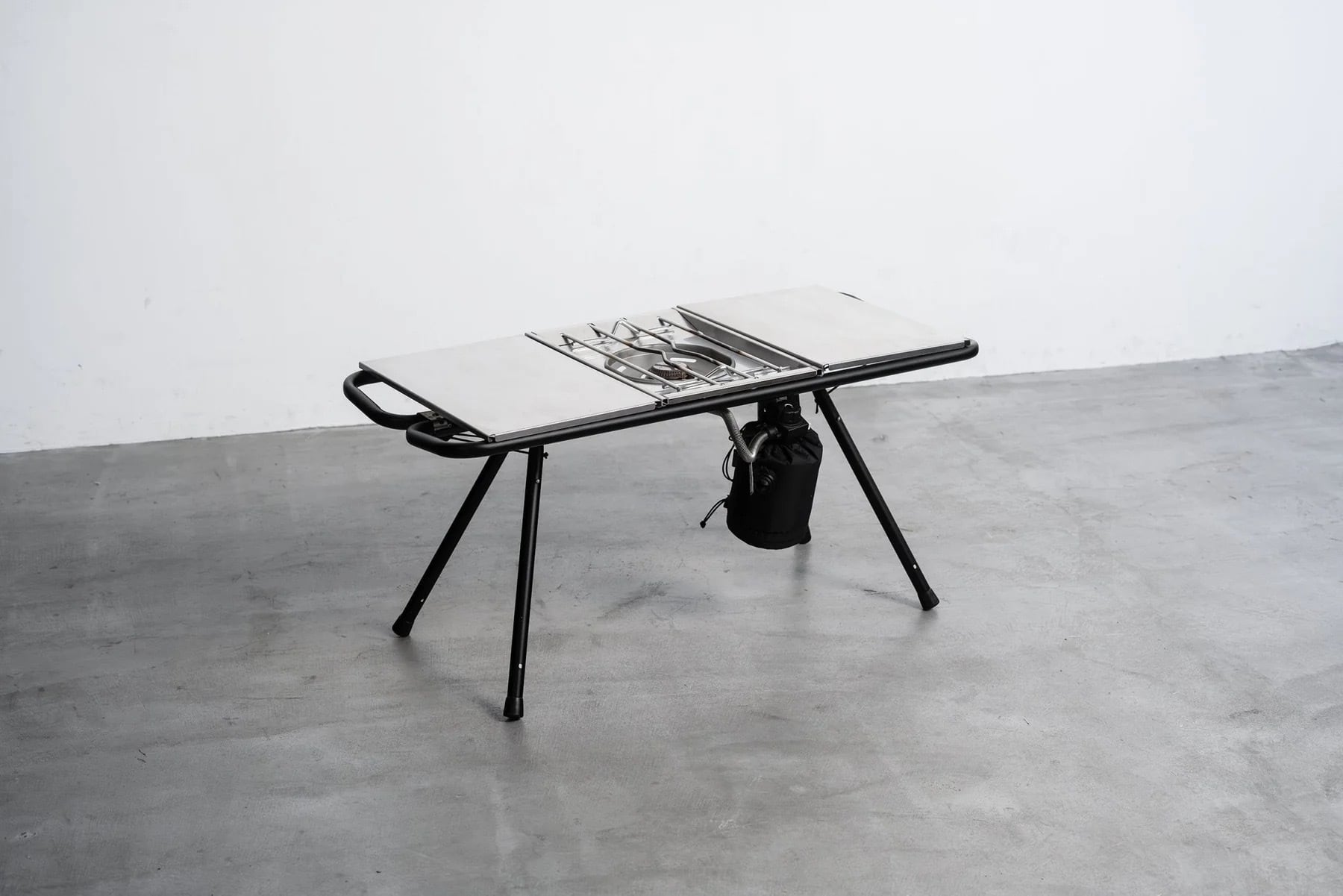 道具を“便利”で終わらせるのではなく、使うほどに想像力を広げてくれる“相棒”のような存在でありたい。そこで、従来のテーブルのイメージを一新し、「変形」することで食事や作業に使えるテーブルになったり、ハンガーラックや棚としても活躍できる柔軟な構造を採用しました。ソロやデュオでのメインとしても、大型テーブルのサブとしても幅広く対応し、荷物を増やさずにどんなキャンプスタイルにも寄り添う多用途設計を実現しています。