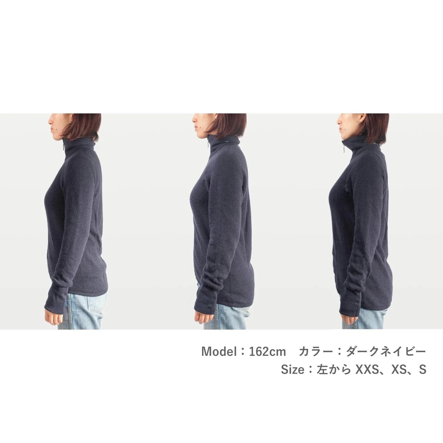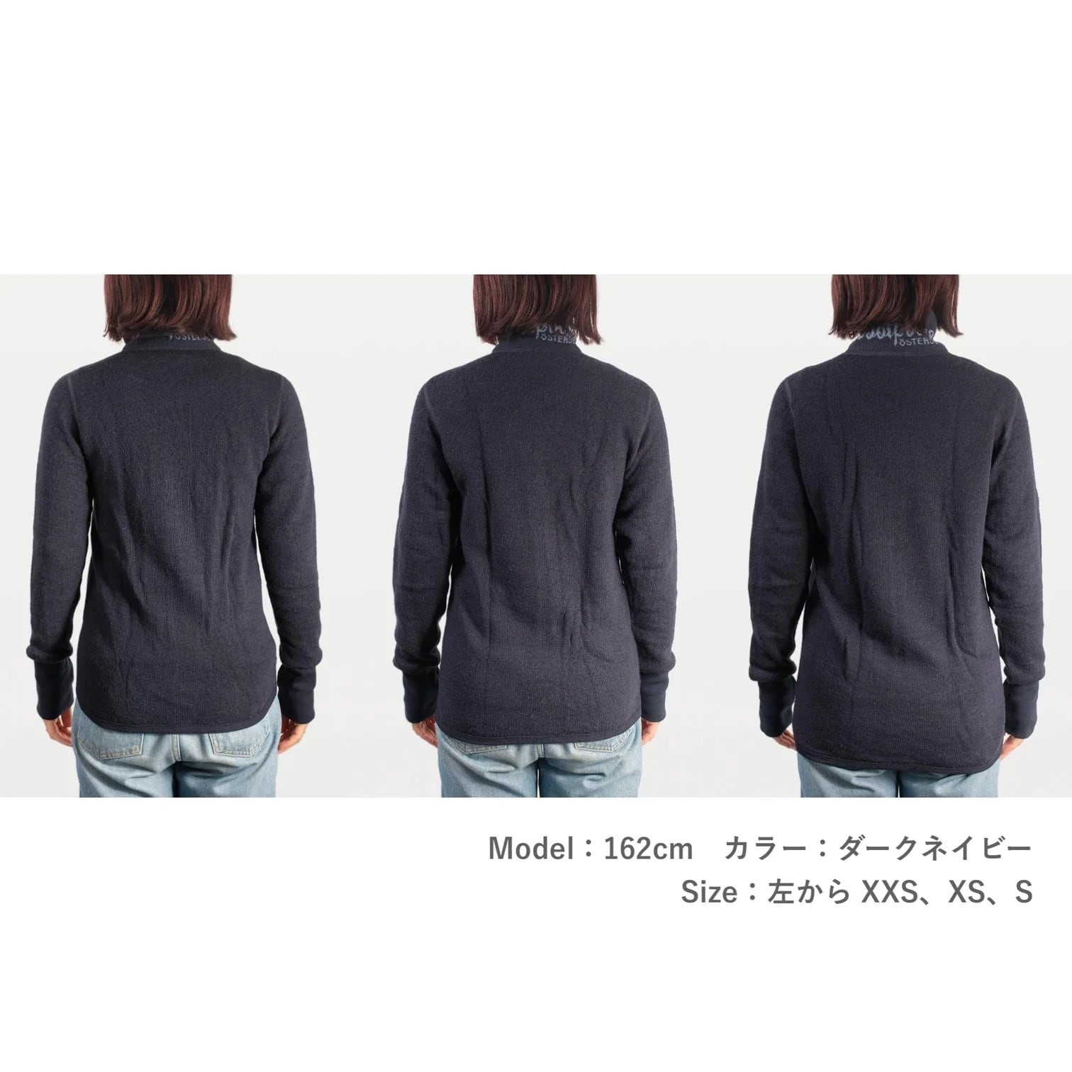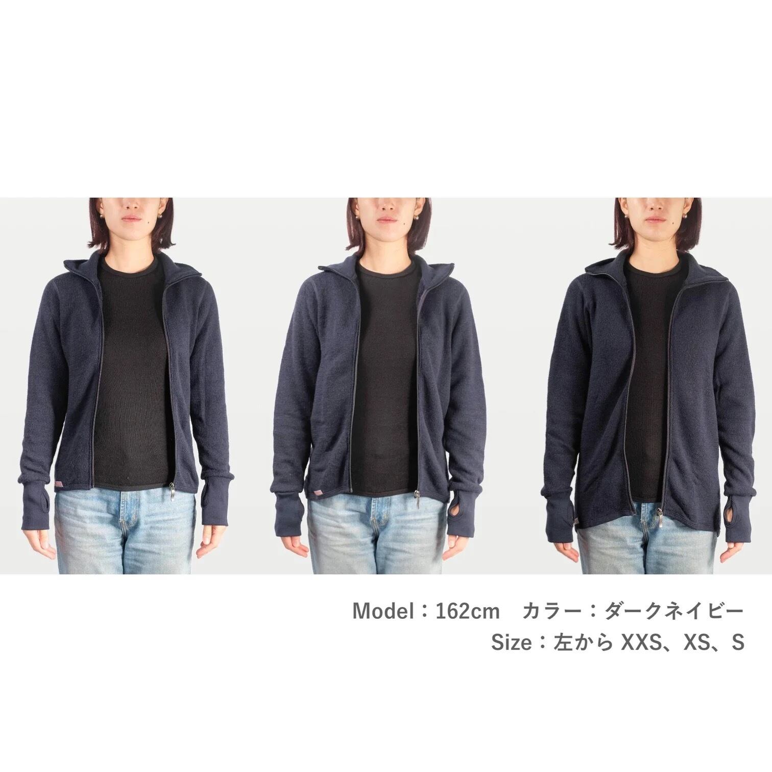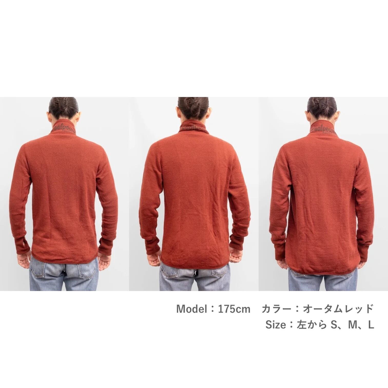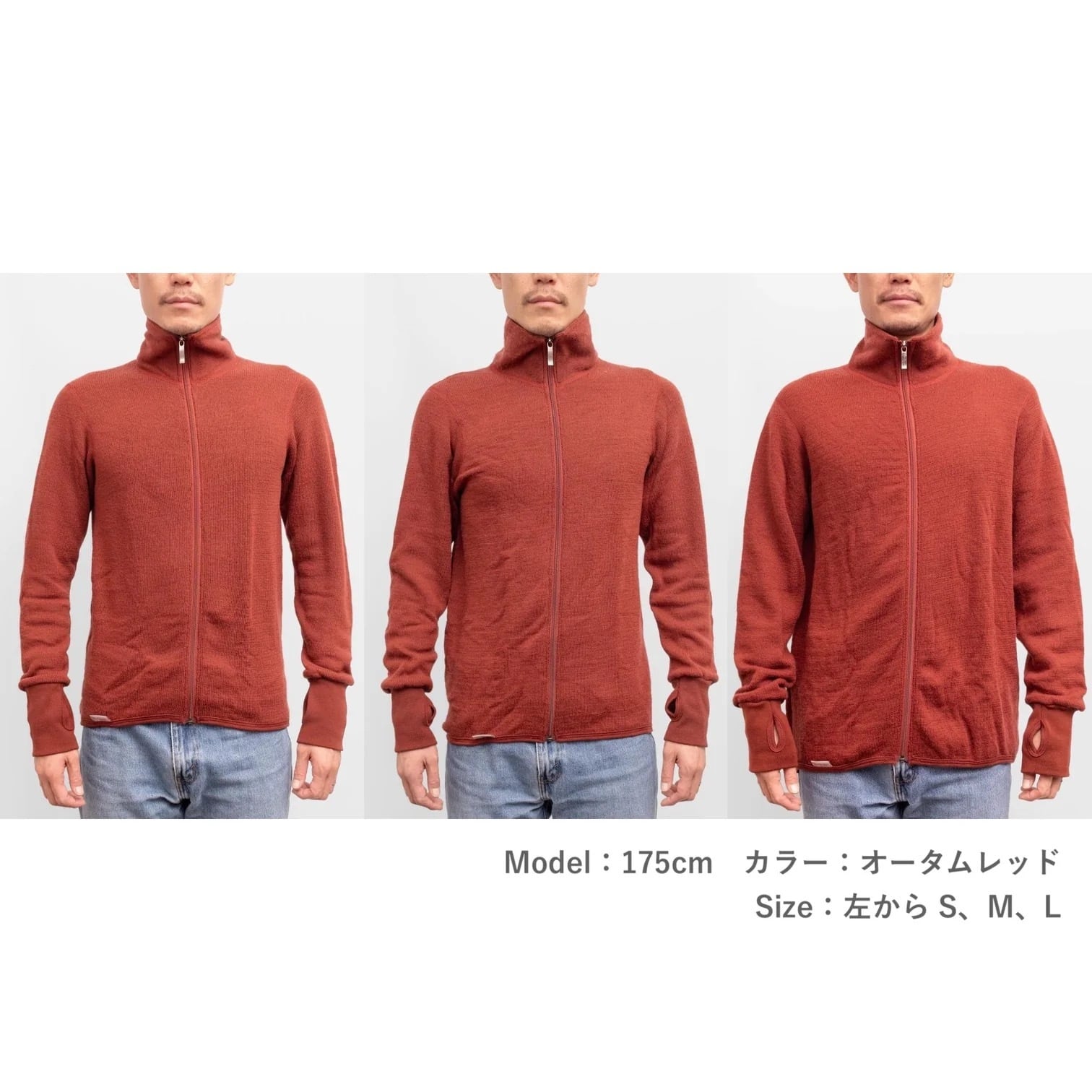「フルジップ ジャケット 400」は、中間着としてしっかり保温したり、肌寒い時には軽く羽織ったりしてもおすすめの前開きのジャケットタイプ。ハイネックの襟元や、サムホールが付属した長めの手首まわり、かがんだ時に背中が出ない丈は、より熱を逃さないように工夫されたデザインとなっています。アウトドア以外でも、日常で着用される方も多い一着で、豊富なカラーバリエーションとともにおしゃれも楽しめるプロダクトとなっています。また、首元には「Woolpower」のロゴが編み込まれています。スウェーデンのブランドらしく、スカンジナビアの人々の体型に合わせて作られているので、袖や丈は少し長く感じるかもしれません。特に女性や細身の男性は、通常着ているものよりもワンサイズ小さいものを選ぶのがおすすめです。