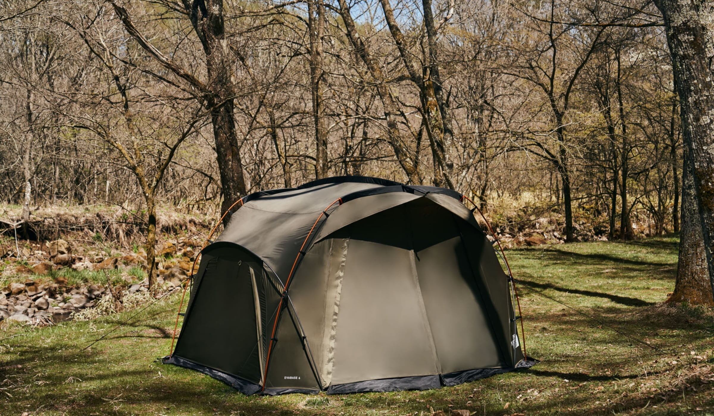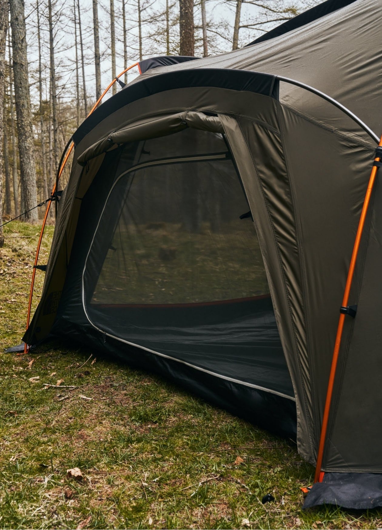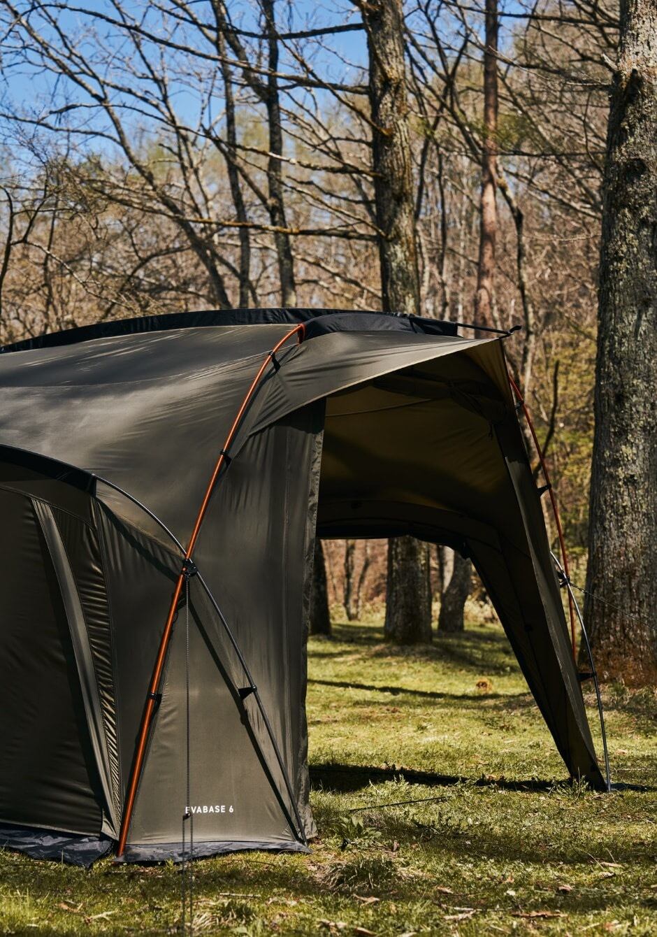 シリーズ中もっとも大型の「Evabase 6」。吊り下げ式インナーを使えば、大人6人が就寝することができます。それ以外にも“ベース”の名前の通り、他の「Eva」シリーズとドッキングできるのが最大の特徴。インナーを外せば大きなリビングスペースとして機能するので、ここを大人数で集まる場所にして、連結させた各「Eva」シリーズを就寝スペースにする、というような使い方もできます。また、四方を大きく開口することもできるので、単体でタープのようにも使えます。