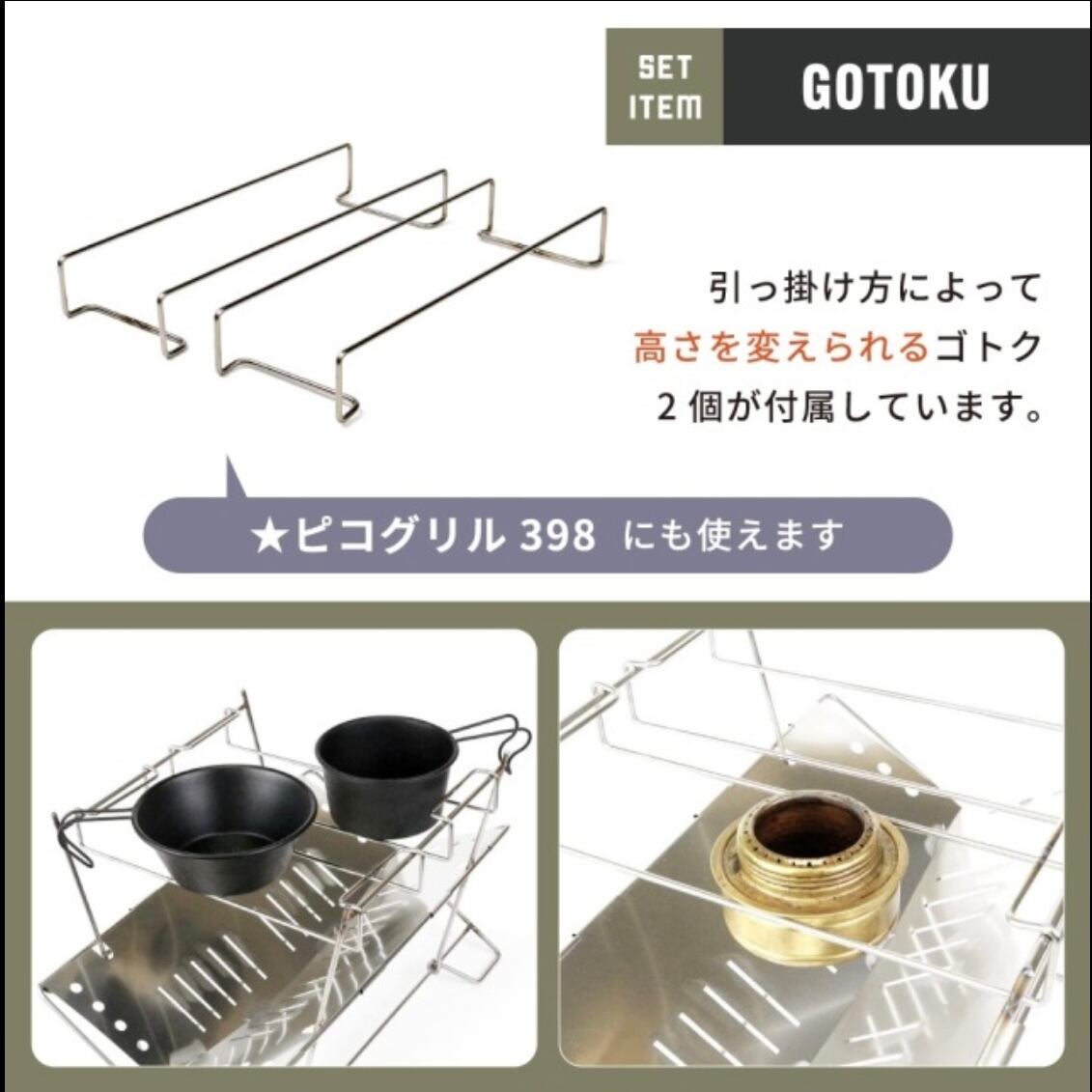 高さが選べるゴトクを2個同梱。ゴトクは高さを変られるので微妙な火力調整が楽しめます。