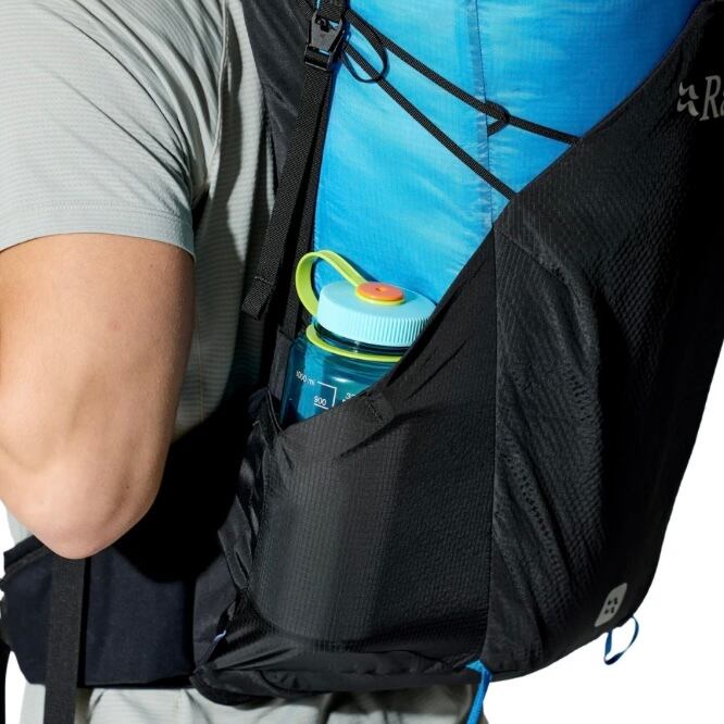 両サイドのスタッシュポケットには1Lのウォーターボトルを収納可能