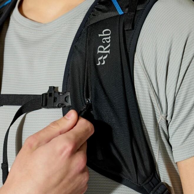 チェストストラップにソフトフラスクや必需品を収納できるポケット付き