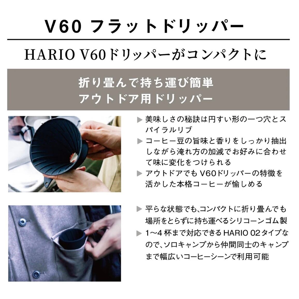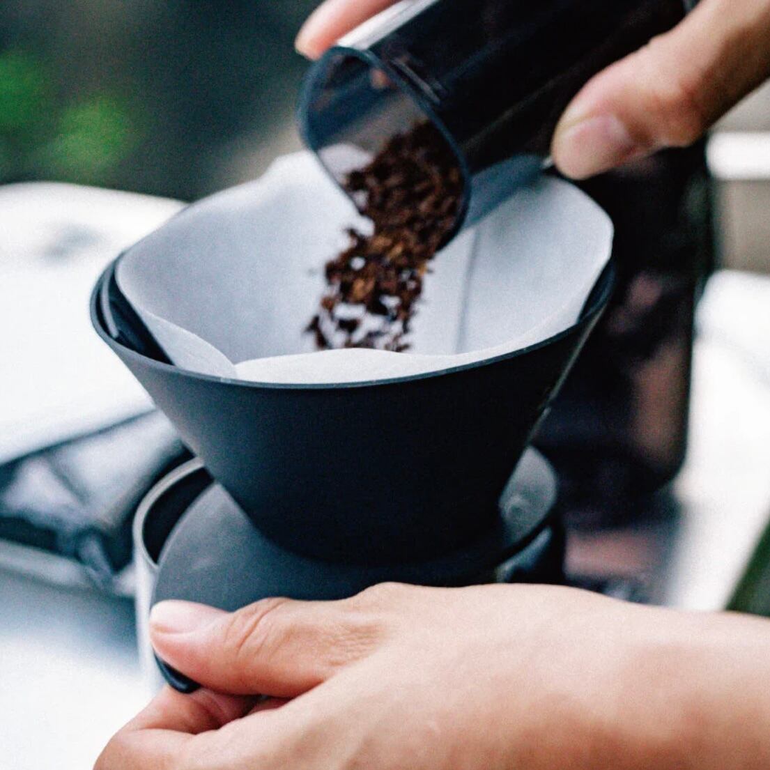 突起とボタンがドリッパー本体とホルダーをしっかり固定し、サーバーやカップにのせた時の安定性が増しました。外でも、お家で使用いただいているV60ドリッパーの使いごこちを再現いただけます。