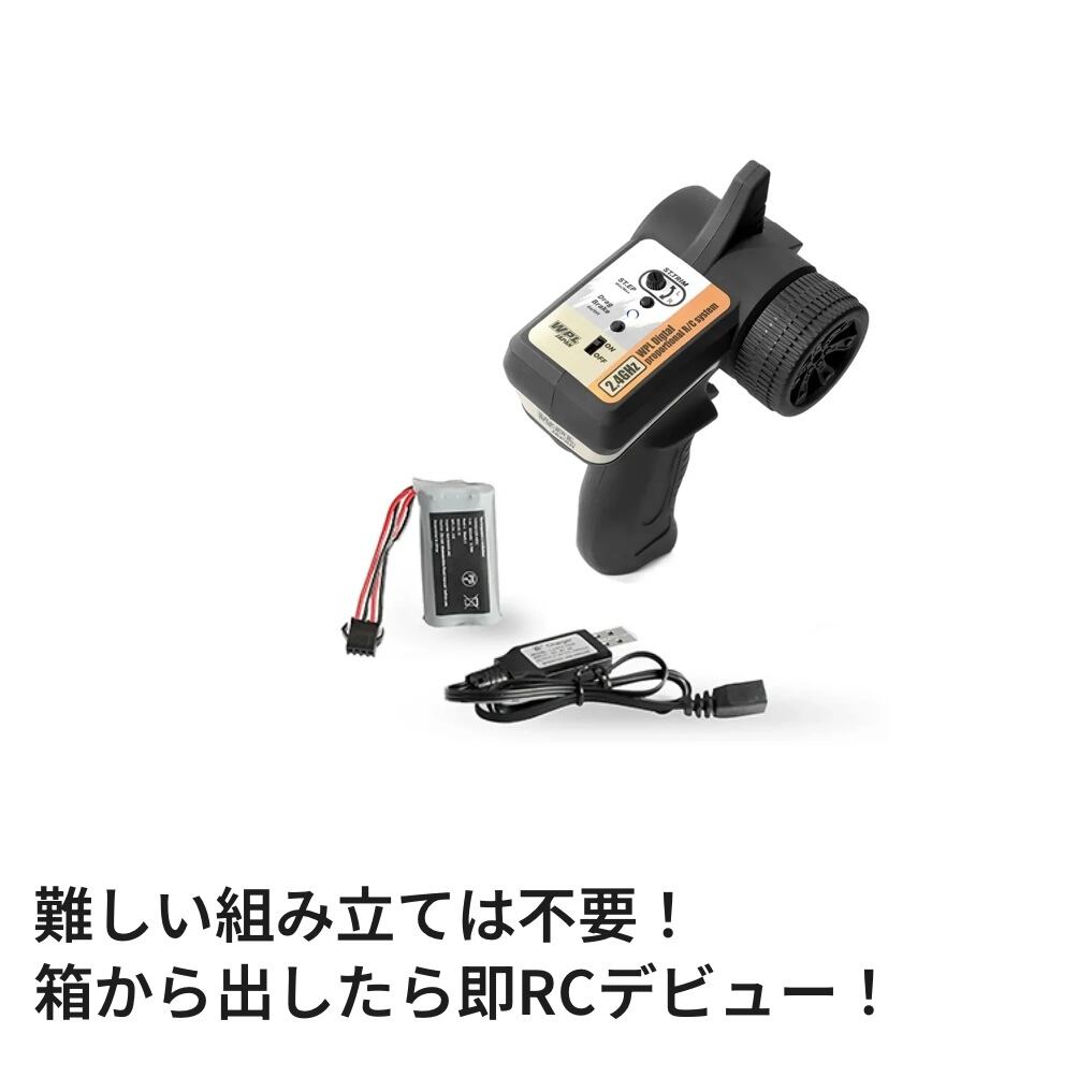 組み立てが不要で、送信機に単三乾電池2本を準備することで、走らせられます。