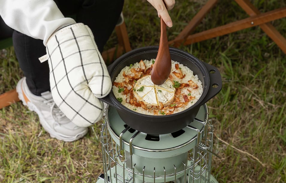 ブルーフレームヒーターの心地よい暖かさはそのままに、暖をとりながら、煮炊きができる調理器としても使用可能。鍋ややかんを置くことができ、煮る・焼く・炊くなど様々な調理もできます。